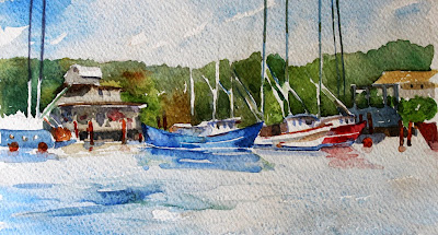 The challenge was to paint all that stuff behind the boats! Things that I couldn't really see, a lots of boat masts and rigging that I didn't want to even attempt to paint around ... Next time, I will make the boats bigger and leave out more of what surrounds them.
